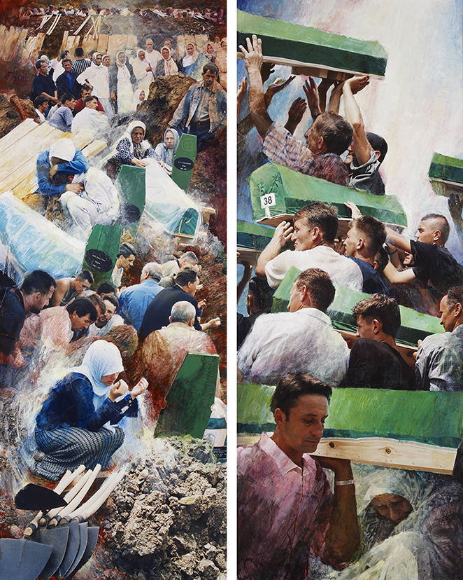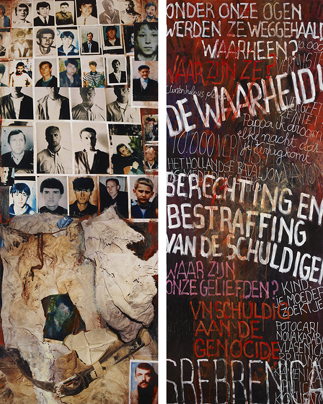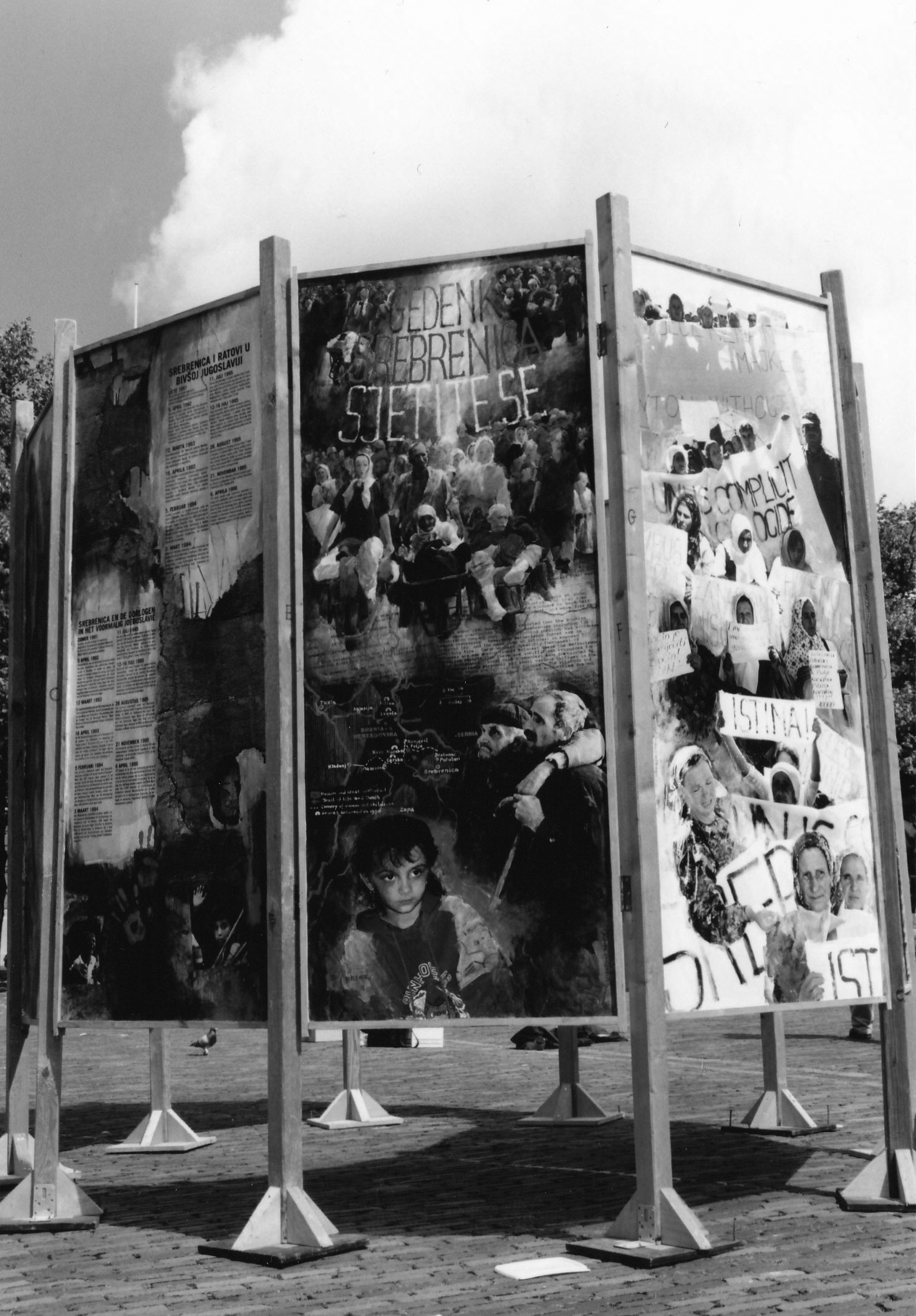 Het monument bestaat uit 10 panelen met fotomontages van de gebeurtenissen op en rond 11 juli 1995 en van de nasleep daarvan.