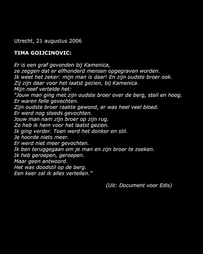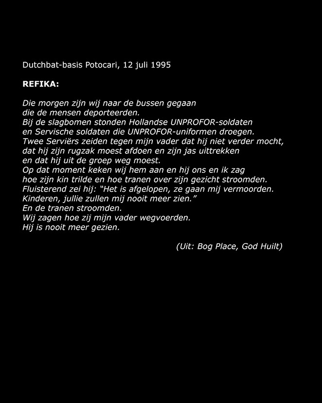 Voor mij als burger van een land dat niets deed om deze genocide te voorkomen, is dat een wetenschap om gek van te worden. Diepe, diepe schaamte. Ik ga niet vrijuit: Nederland was ook in mijn naam aanwezig in Srebrenica. Ervan weten verplicht: ik ben medeverantwoordelijk! Maar wat kan ik doen? Het minste is: getuigen van het drama van de doden en van de overlevenden... erbij zijn als op het grafveld van Potocari tegenover de voormalige Dutchbat-basis jaarlijks op 11 juli de tienduizenden nabestaanden hun doden begraven, hun vader, hun man, hun kind. Het verdriet is peilloos, stil en wanhopig. Met schaamte richt ik mijn lens op dit gebeuren dat afgesloten lijkt van de rest van de wereld, en waarvan ik voor even deelgenoot ben. Wat zich hier jaar na jaar afspeelt, de nasleep van dit drama moet gezien en geweten worden! Beelden zeggen soms zoveel meer dan woorden...